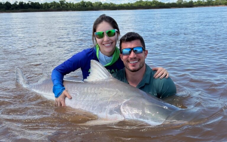 Turistas pescam peixe gigante que não pode ser consumido pela terceira vez Um casal de turistas pescou, pela terceira vez, uma piraíba, um peixe gigante de água doce que não pode ser consumido, no Rio Araguaia, na região de Aruanã. O exemplar tinha 1,8 metro e aproximadamente 80 kg, sendo considerado o mais pesado já capturado pelos dois. Após a pesca, animal precisa ser devolvido ao rio devido a questões de preservação. ✅ Clique e siga o canal do g1 GO no WhatsApp Segundo Paulo Tavares e Lorane Mens, eles já haviam fisgado outras piraíbas em viagens anteriores. Em 2024, chegaram a capturar um peixe maior em comprimento, mas mais leve. Já em 2025, o exemplar foi menor. Desta vez, apesar de não ser o maior, o peixe foi o mais pesado entre os três. “Essa foi a mais pesada que já pegamos. É um troféu”, afirmou. A pescaria do casal começou na segunda-feira (13) e deve seguir até o dia 16. LEIA TAMBÉM: Maior peixe de água doce de couro do Brasil e que pode pesar mais de 200 kg: conheça espécie que não pode ser consumida em Goiás Entenda por que peixe de 1,8 metro pescado no Rio Araguaia não pode ser consumido Irmãos que pescaram peixe de 2 metros e cerca de 100 kg que não pode ser consumido tentaram por quase 10 anos capturar animal tão grande Casal pega peixe de 1,80 metro, em Goiás Arquivo pessoal/ Lorraine Mendes Peixe apareceu durante almoço De acordo com o casal, o peixe foi fisgado enquanto a equipe preparava o almoço. Assim, a comida precisou ficar de lado até o peixe ser pego. “O arroz chegou a ser derrubado, mas depois deu tempo de terminar e almoçar”, disse. Conforme o casal, a captura exigiu esforço e coordenação de toda a equipe, que lutou cerca de 40 minutos para vencer o peixe. Paulo ainda destacou que a captura de um peixe desse porte só é possível com o apoio de profissionais experientes na região. “Sem eles não tem a menor condição de tirar um peixe desse. Você precisa estar no lugar certo, com a linha posicionada corretamente e com o controle do barco”, disse. Turistas pescam peixe de 1,80 m em Goiás Tradição e história do casal A pescaria também tem um significado especial para o casal. Segundo Lorane, foi no Araguaia que os dois começaram o relacionamento, há cerca de cinco anos. Desde então, todos os anos o casal volta para a região para reviver o momento. “Foi nossa primeira viagem juntos. Desde então, nunca mais paramos de pescar”, contou.Acompanhe mais notícias em nosso site.